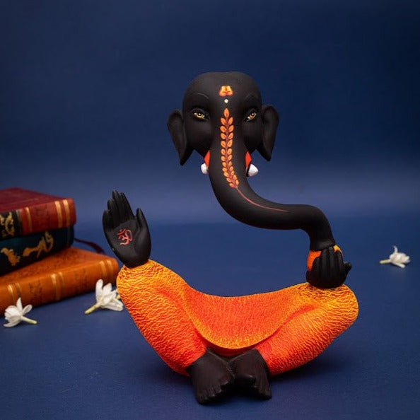 - Adorned with a saffron drape and a painted streak on the trunk, this Ganesha sculpture symbolizes goodness, positivity, and divine blessings.